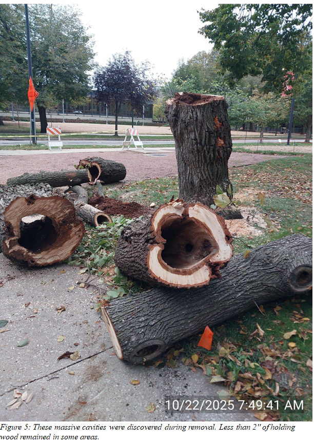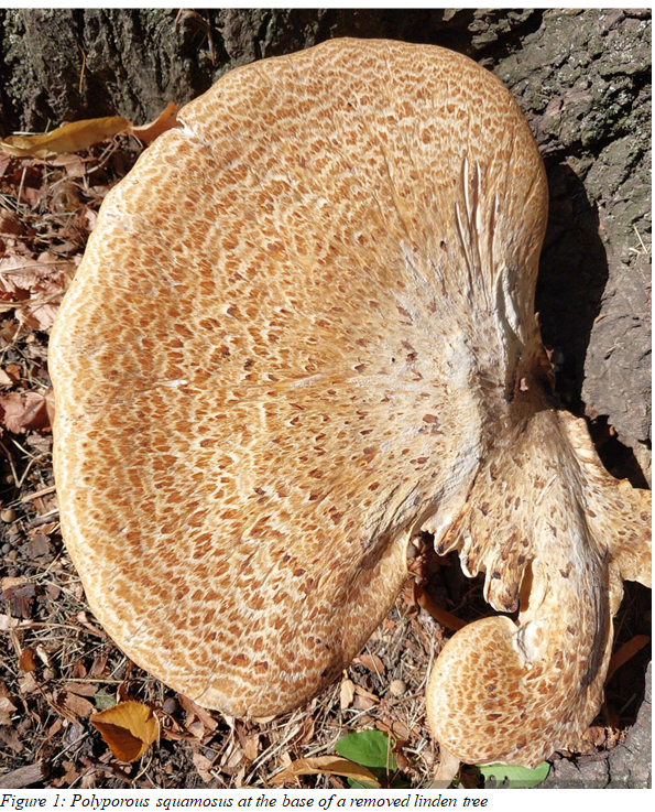 The linden trees removed all showed signs of advanced decay and significantly compromised structural stability. Some had fruiting bodies (mushrooms/conks) present on tissues, indicating an advanced degree of decay. Several of the trees have Polyposous squamosus conks, a fungus which causes white rot. This fungus isn’t the sole cause for removal, but it is a positive indicator of active decay.