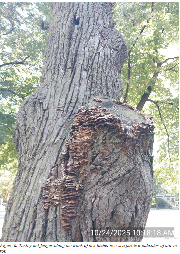The third linden tree across the street had extensive brown rot, causing internal decay and compromising the structure. The causal fungus is likely Turkey tail, Trametes versicolor. Brown rot is a decay of the cellulose, taking away flexibility and leaving only the lignin of cell walls behind. This tree had lost a large limb just a few weeks prior, likely resulting from the brown rot, creating a very brittle structure. Active root decay was also observed, potentially Gandonerma species, which had created fruiting mushrooms just above the soil surface, radiating away from the trunk. These fungi can be very serious and may infect healthy wood and tissues, further accelerating the decay process.