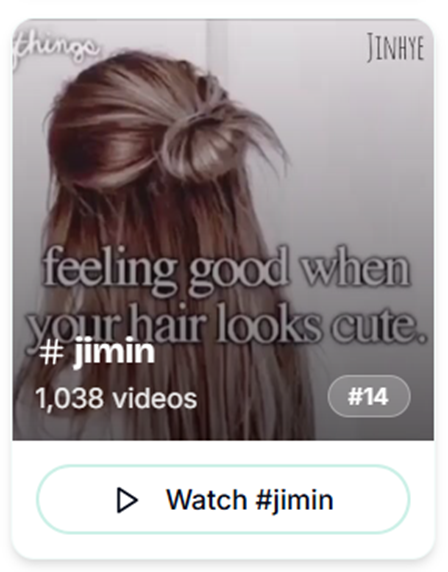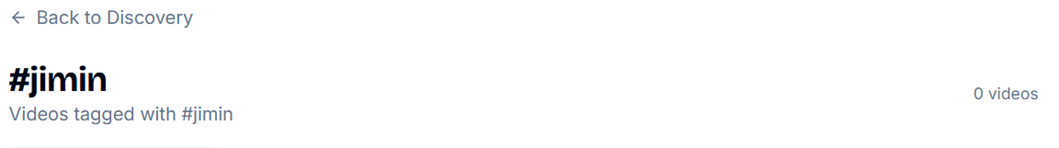 I did click on the “#jimin” page, just to see what was there. I had wanted to watch a couple of videos anyway, to get a sense of how it worked, and decided that if I was referencing the video above, I wanted to credit the creator. However, when I clicked on “#jimin”, it took me to a page that said there were 0 videos available with that hashtag. According to the hashtag page on Discovery, there were 1,038. (I’ve included screenshots below just so people know I am not going crazy.)